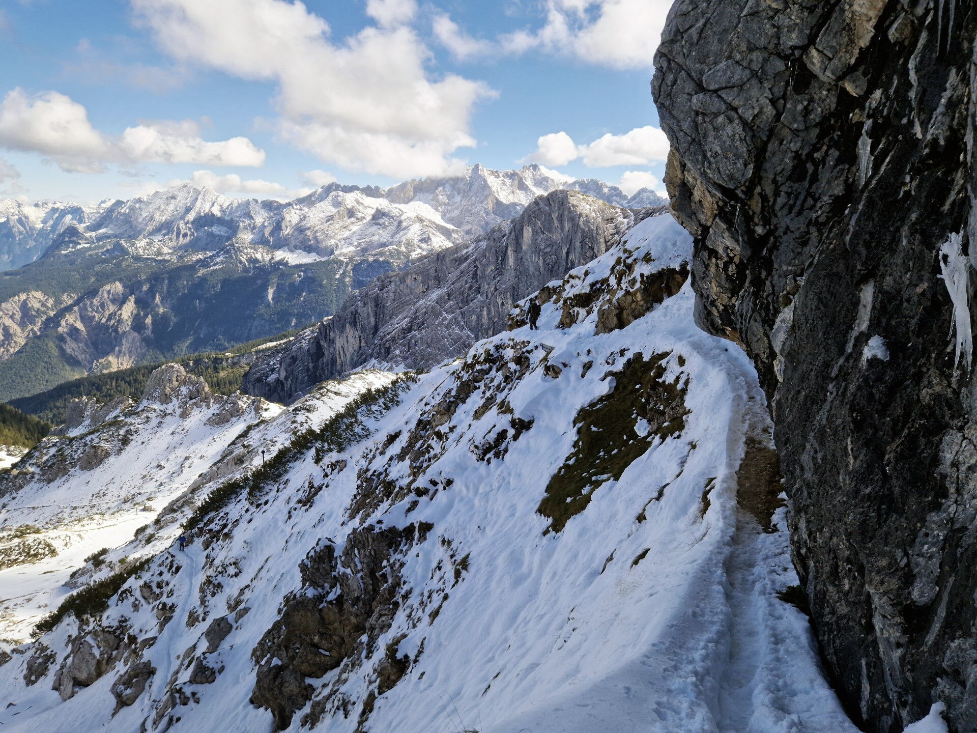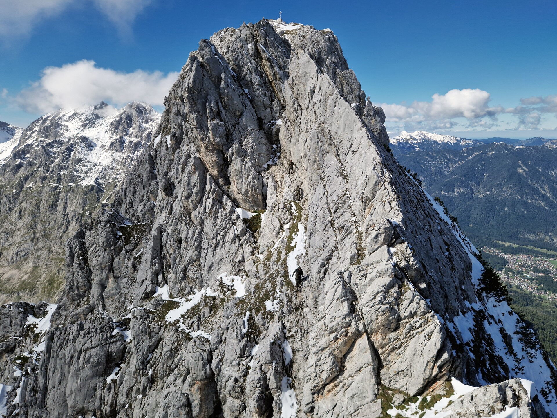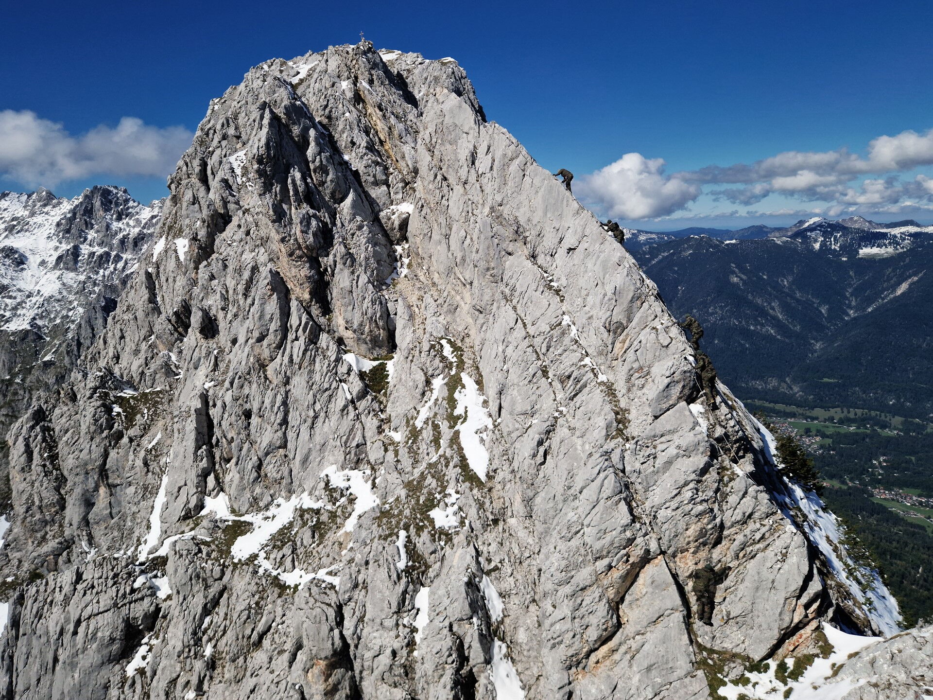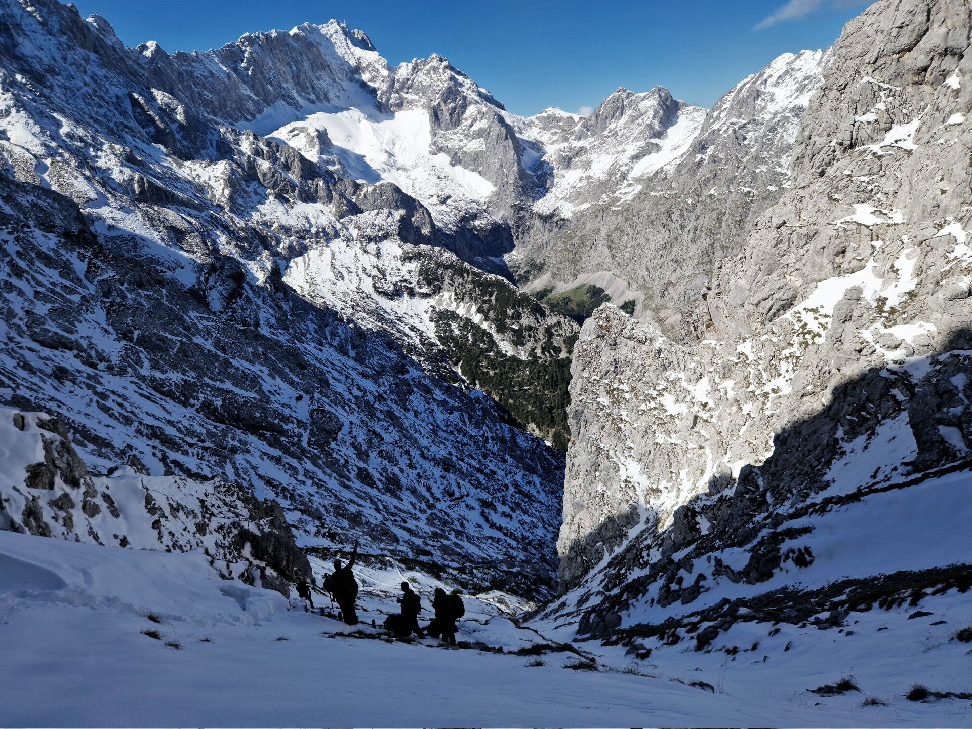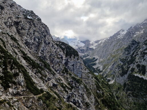 Der geplante Aufstieg auf die Zugspitze ist aufgrund der Wetterlage unmöglich. Obwohl es noch September ist, sind in den letzten Tagen knapp 60 cm Neuschnee auf der Zugspitze und deren Hängen niedergegangen. Auch den Aufstieg auf die Alpspitze musste eine Gruppe unter der Führung eines Bergführers abbrechen. Grund genug, die Entscheidung zu treffen, eine Alternativroute zu nehmen. Hinauf auf den 2.150 m hohen Höllentorkopf. Dessen Nordroute ist technisch anspruchsvoll und bietet einen beeindruckenden Ausblick.