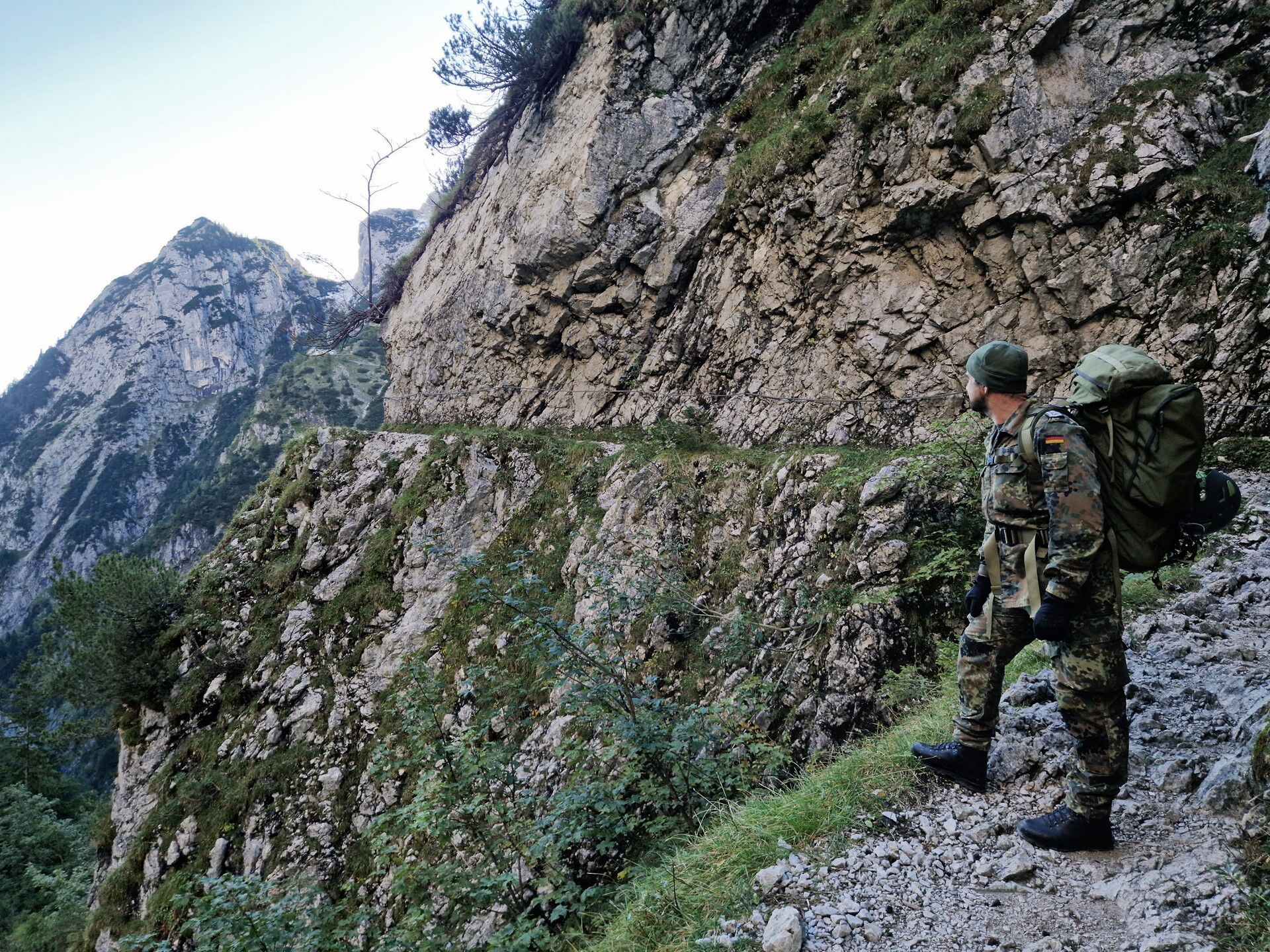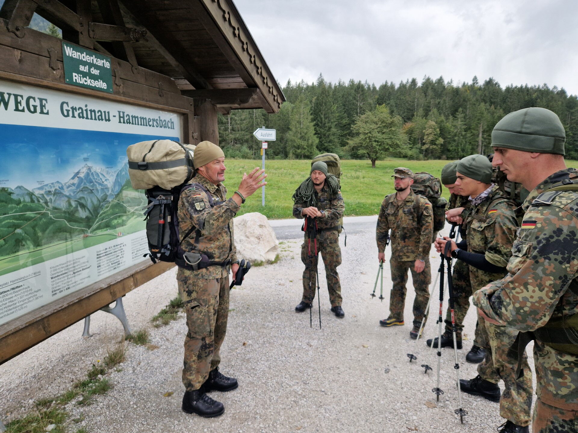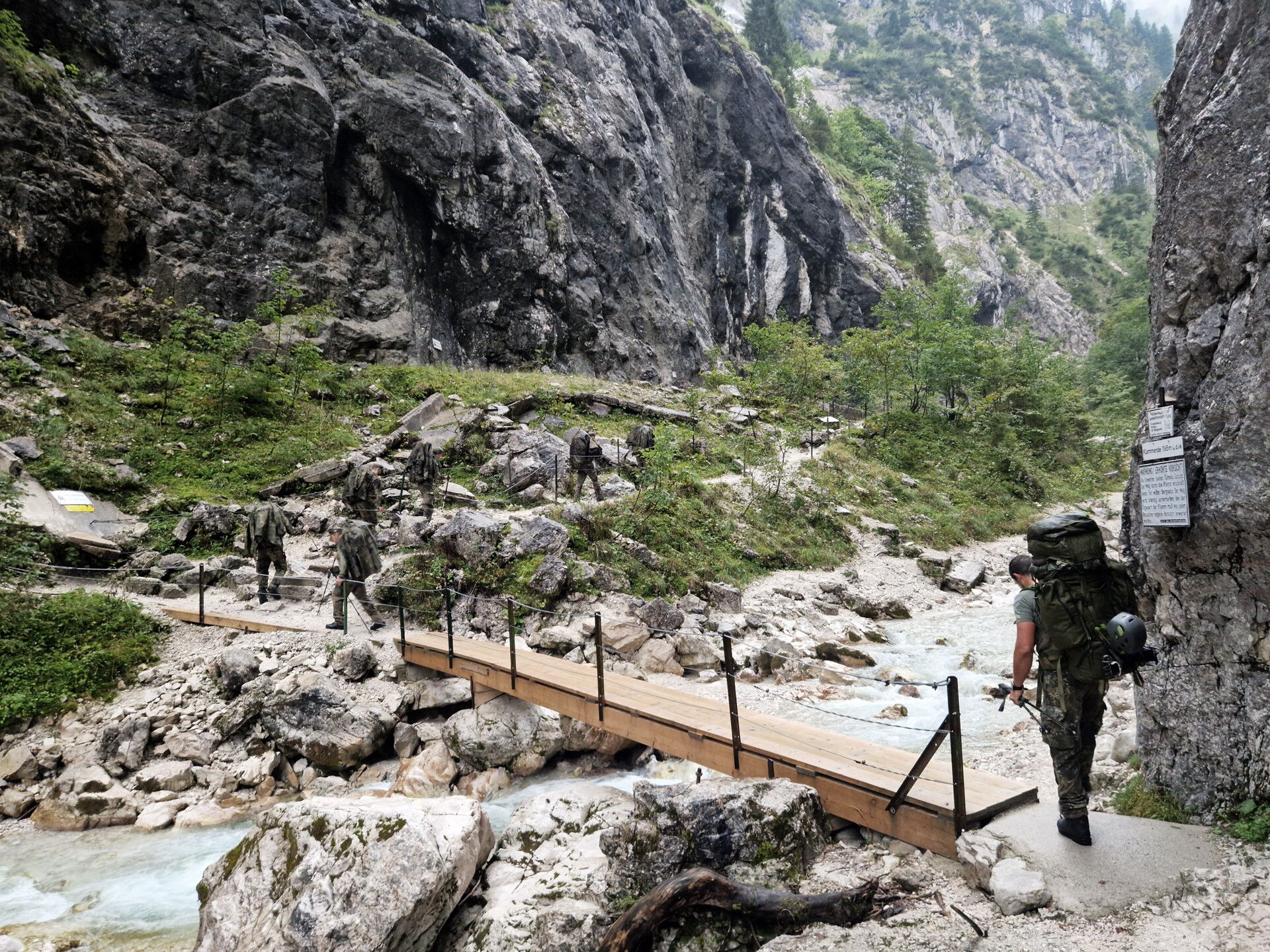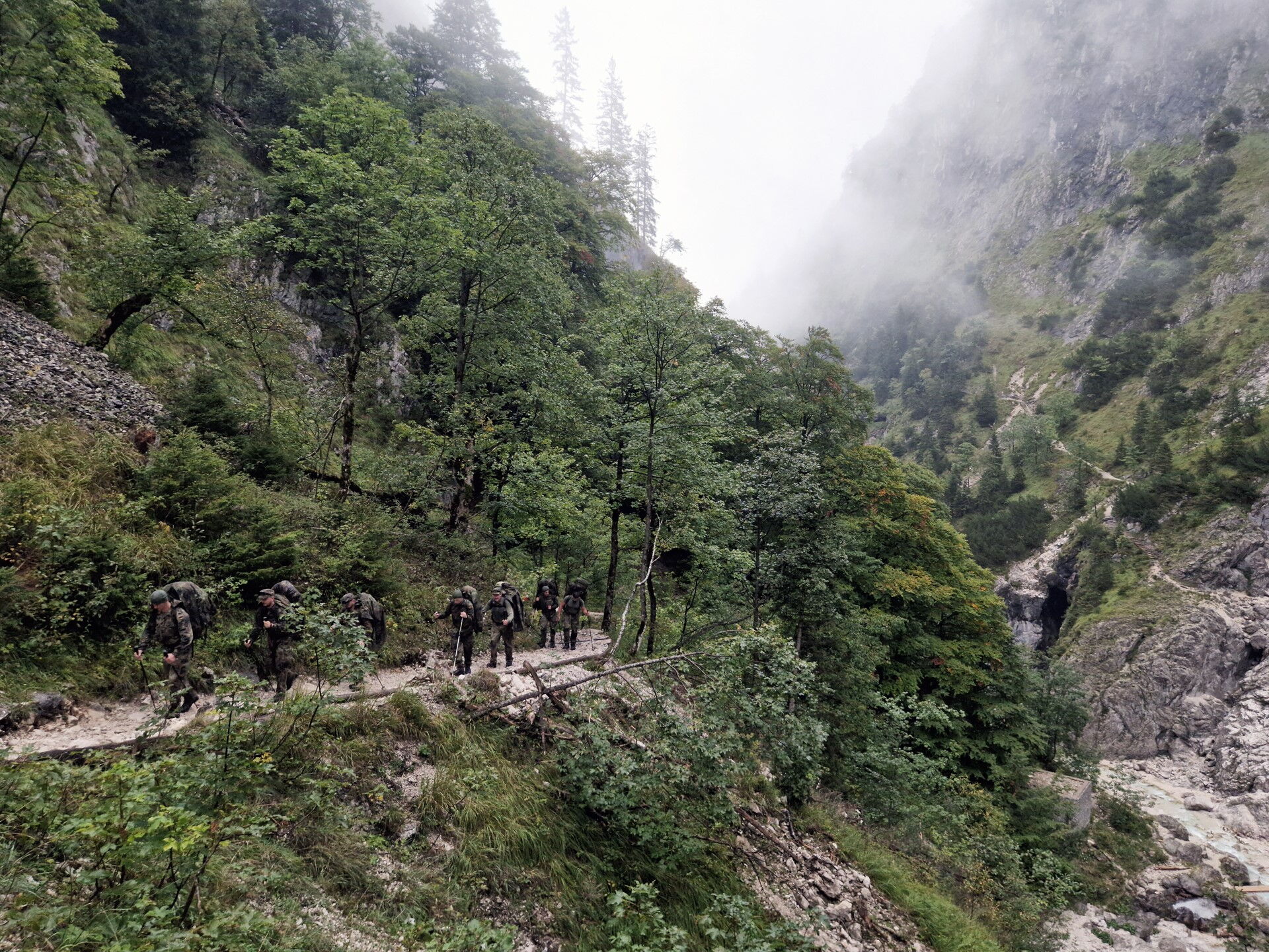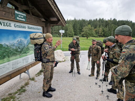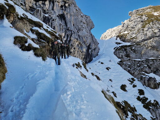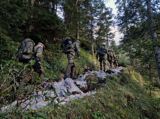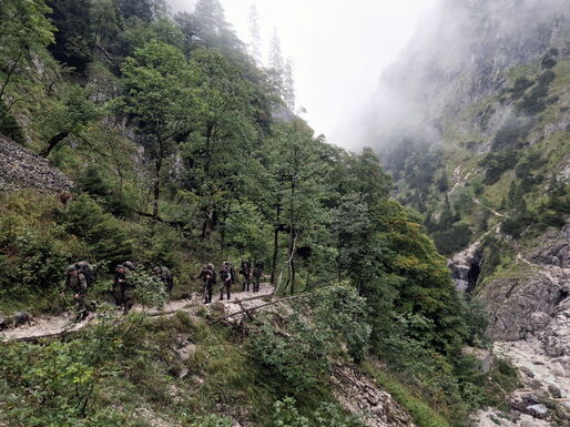 Der Aufstieg führt die acht Soldaten der Hochgebirgsgruppe der 2. Kompanie vom Parkplatz Hammersbach durch das Höllental hinauf zur Höllentalangerhütte auf 1.387 m. Dabei überwinden sie unter der Führung des Heeresbergführers Stabsfeldwebel Peter Schöddert mit knapp 30 kg Gepäck auf fünf Kilometern 765 Höhenmeter.
